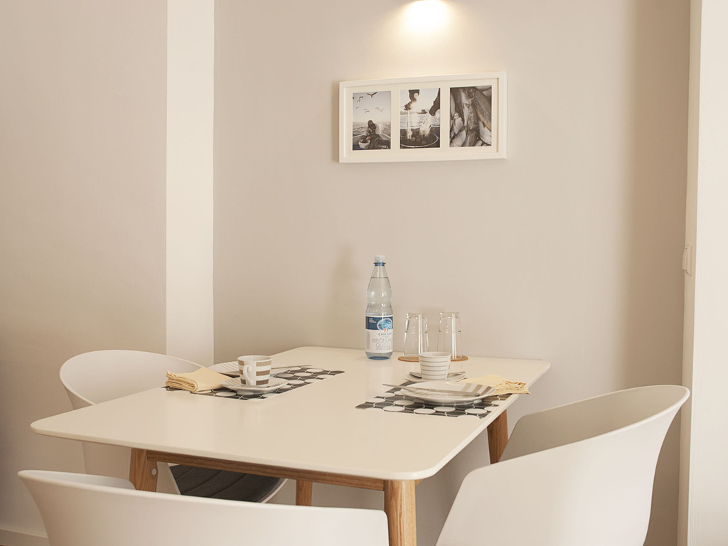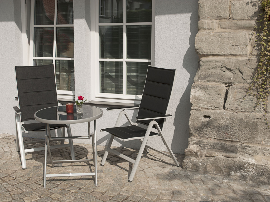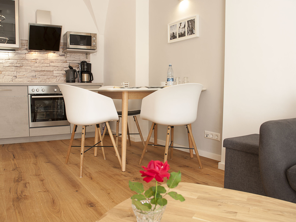 Vor dem Appartement gibt es eine Sitzgelegenheit mit einem Tisch um die Sonne genießen zu können.