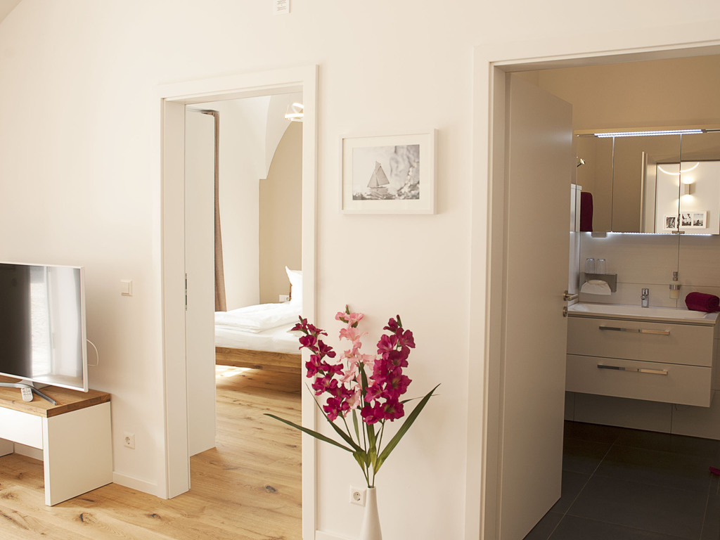 Das Schlafzimmer ist mit einem Doppelbett mit hochwertigen Matratzen, zwei Nachttischen mit Beleuchtung und einem Kleiderschrank ausgestattet. Im angrenzenden Abstellraum finden Ihre Koffer Platz.