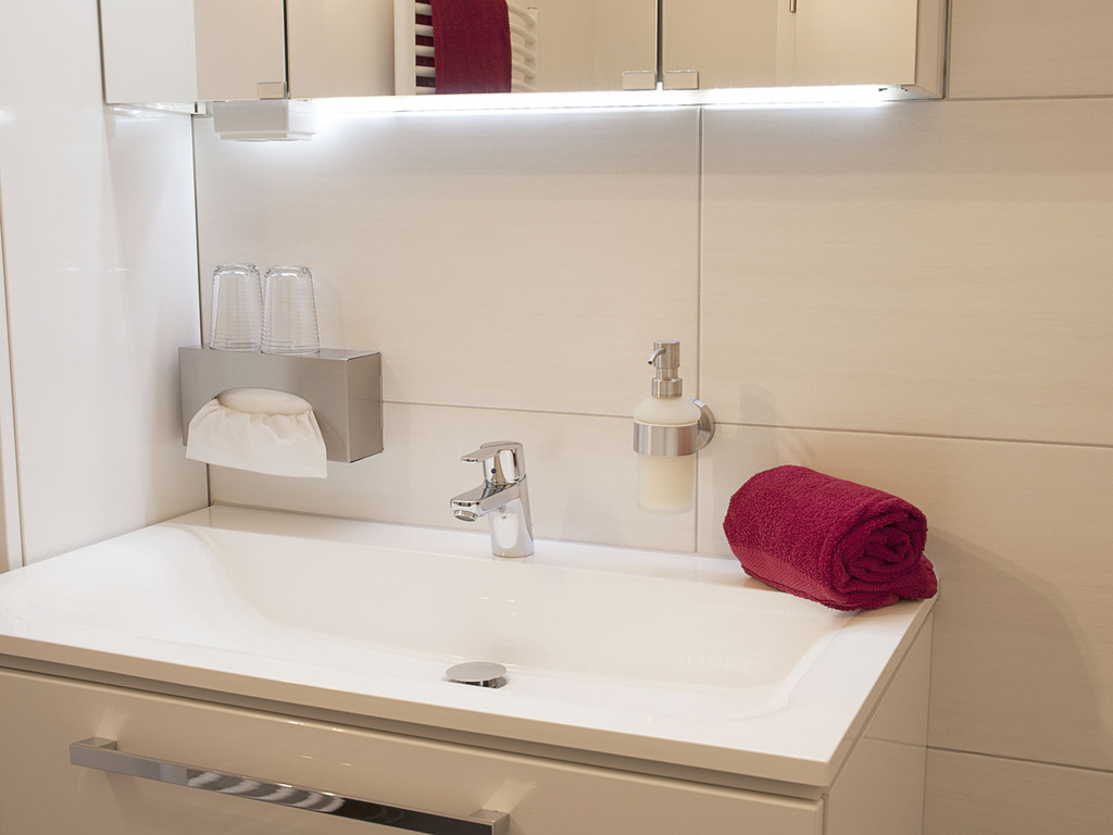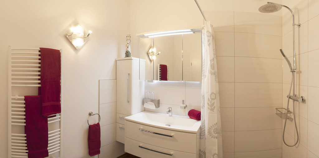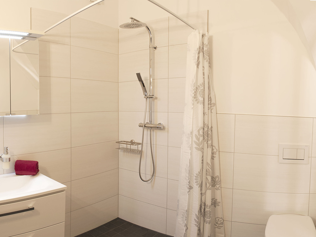 Das moderne Badezimmer ist mit barrierefreier Dusche, WC und Haarfön eingerichtet.
